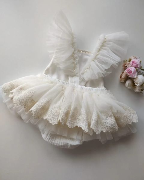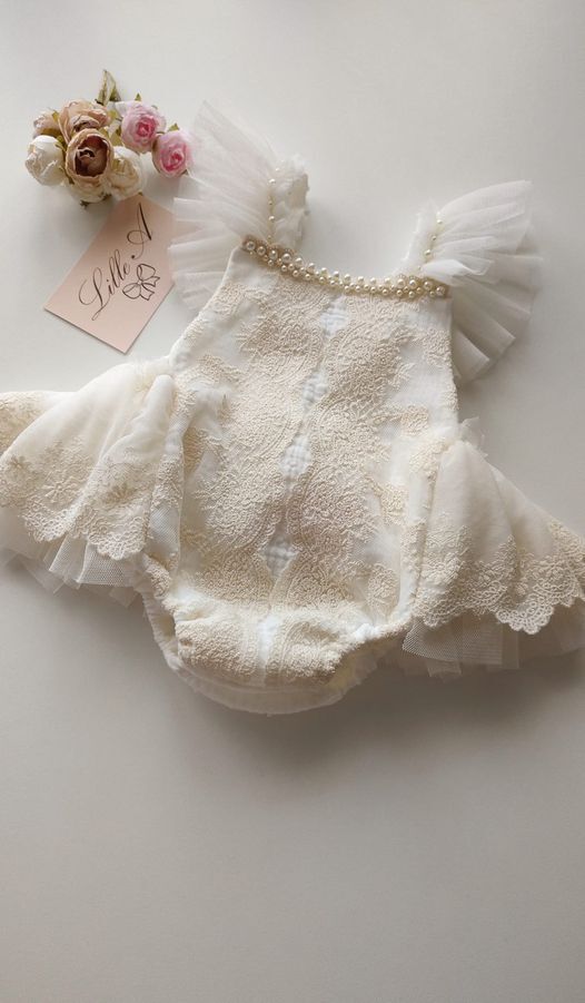 Romper Evelyn elegant si confortabil ,realizat din muselina brodata,dantela brodata ,volane delicate din broderie si tull fin,accesorizat cu perlute cusute manual. Timp executie 10-21 zile.