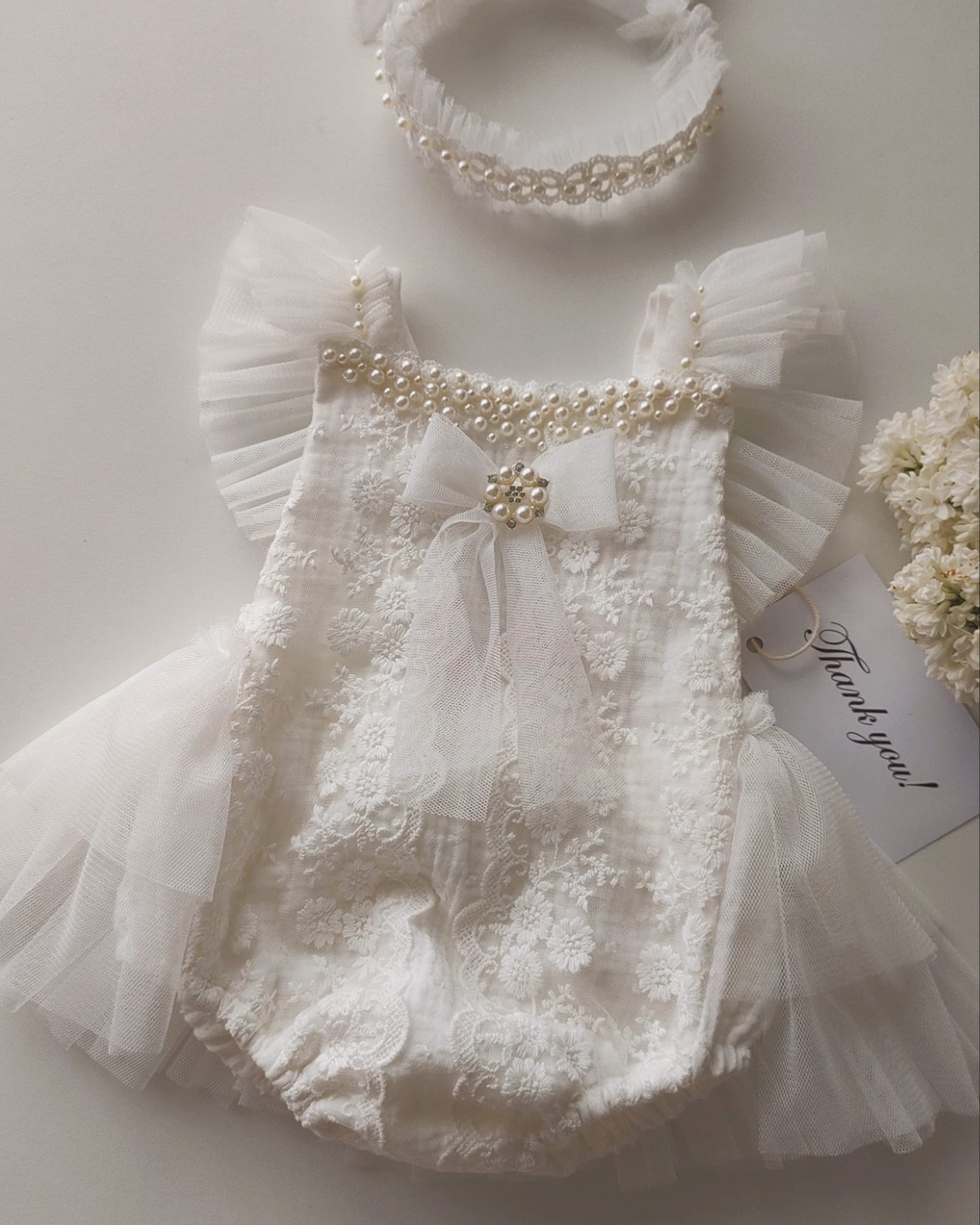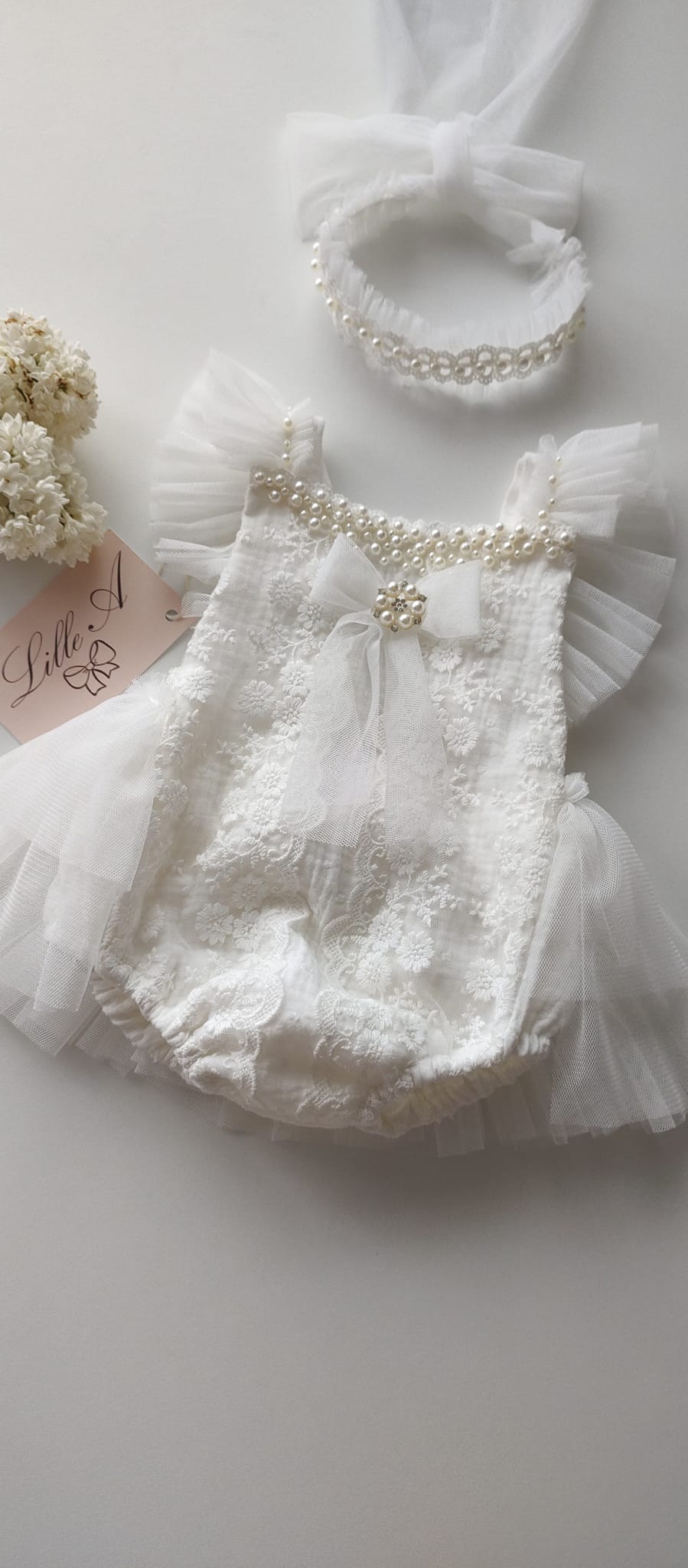 Molly model unic si delicat,realizat din muselina brodata,dantela si volane tull moale.Rompeul este accesorizat cu perlute,fundita din tull si brosa perle.