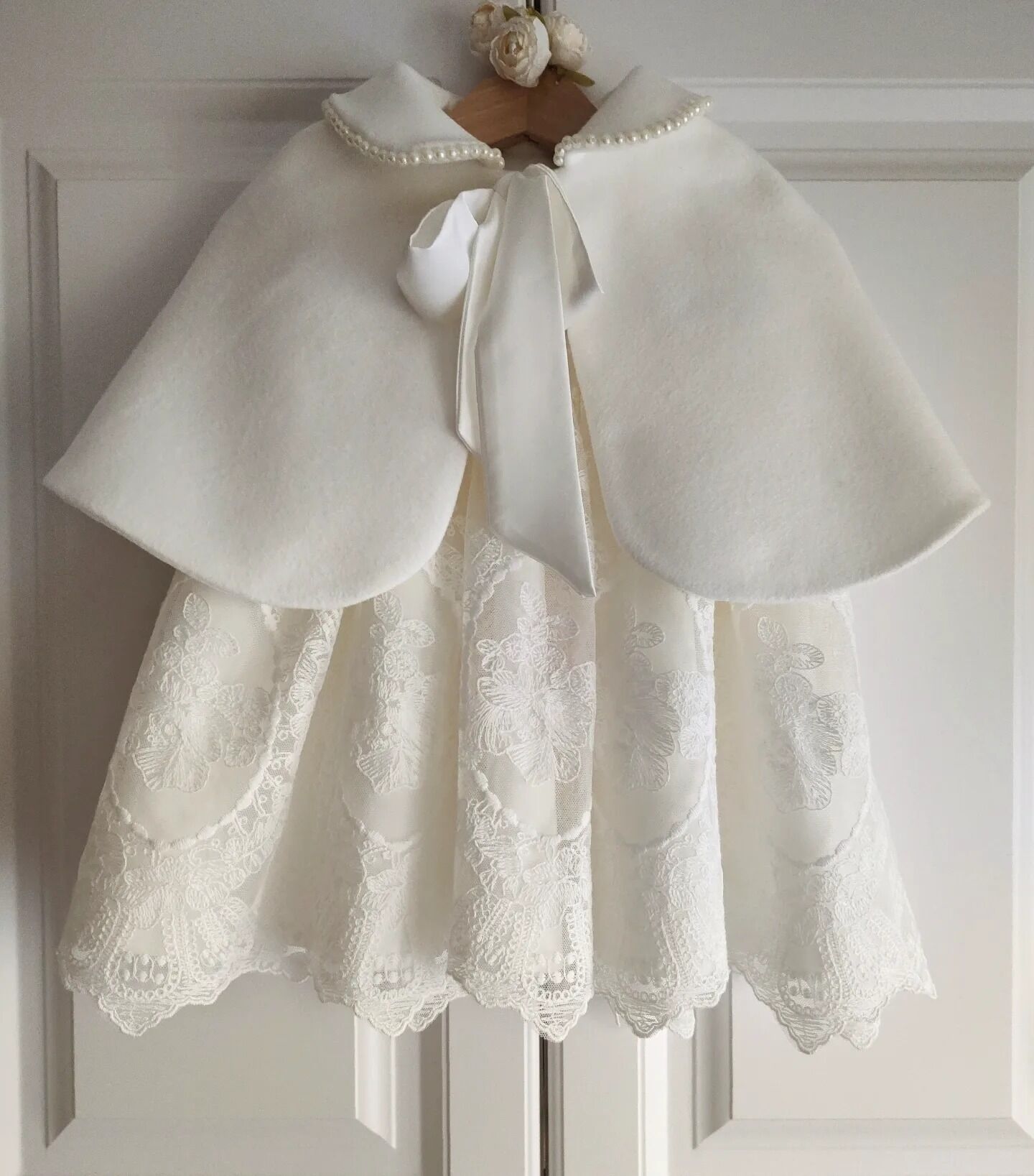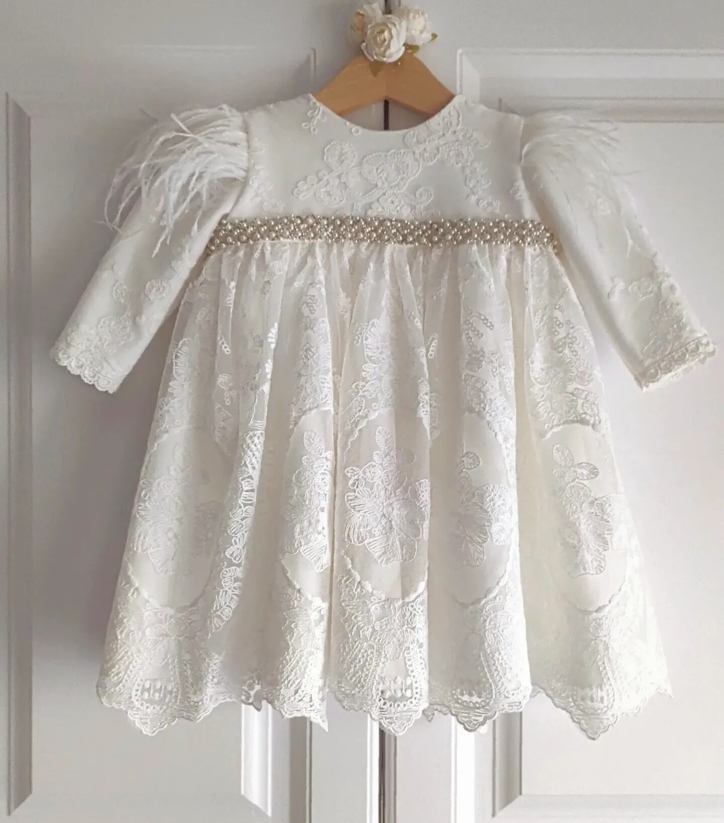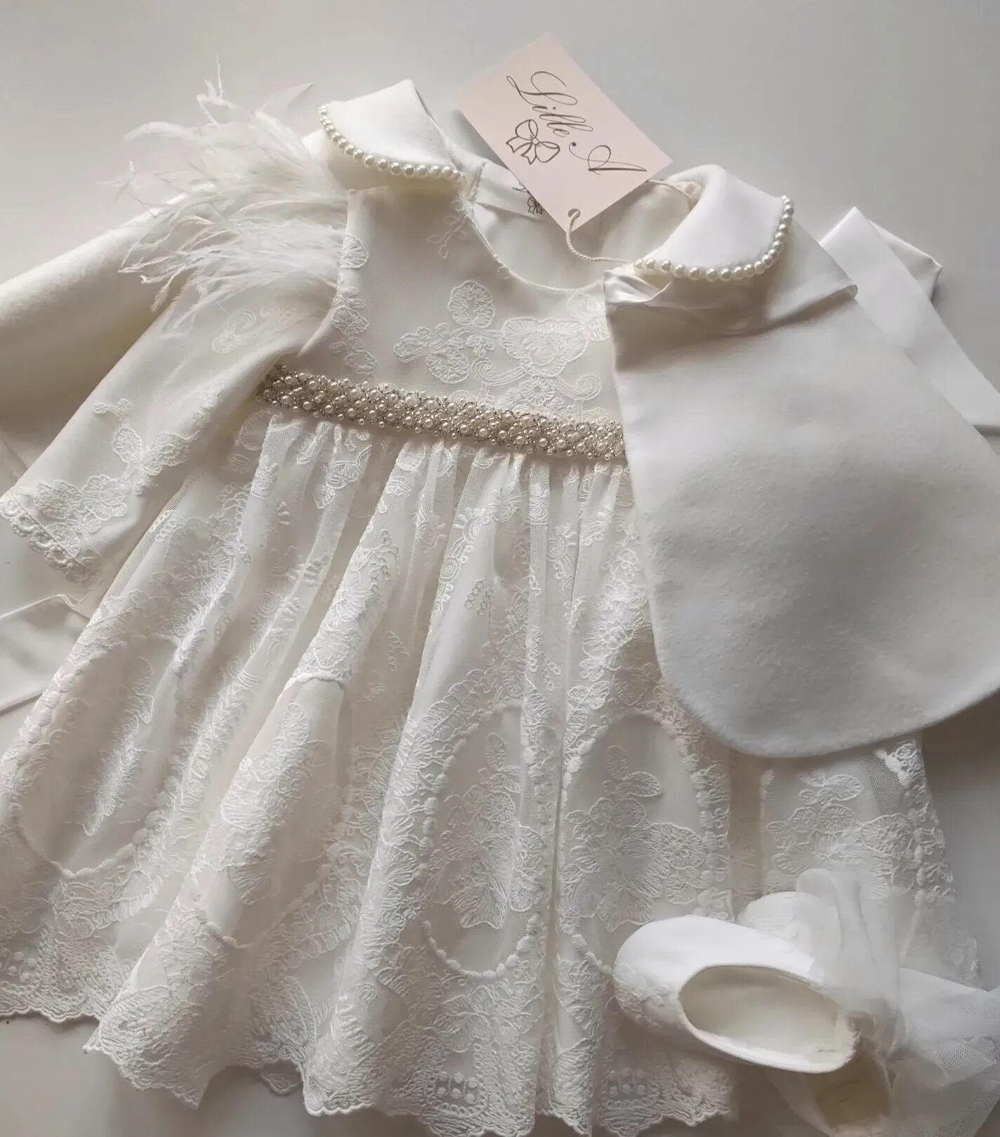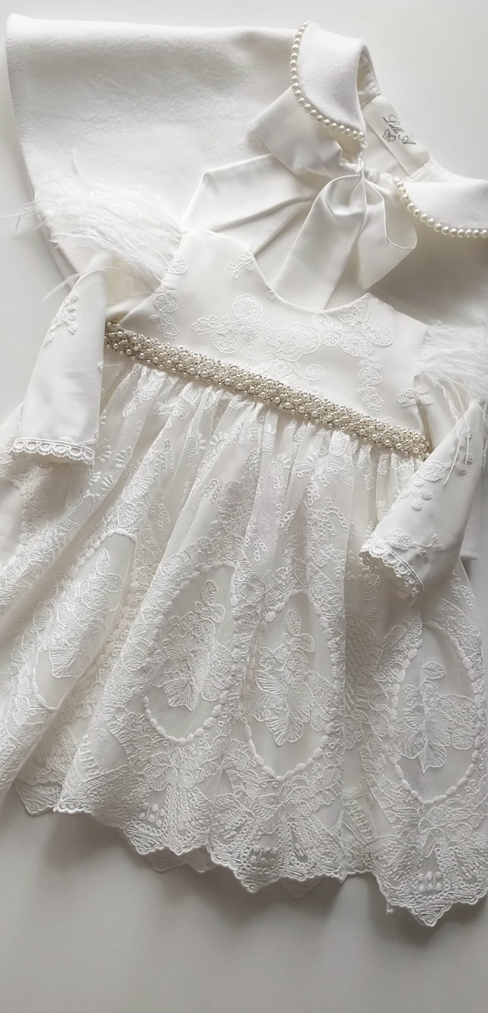 Rochia Angel este realzata din dantela brodata cu detalii pene si perlute,la interior captusala moale pentru confortul bebeluei.Se pot realiza papucei 55 lei,bonetica asortata 65 lei.