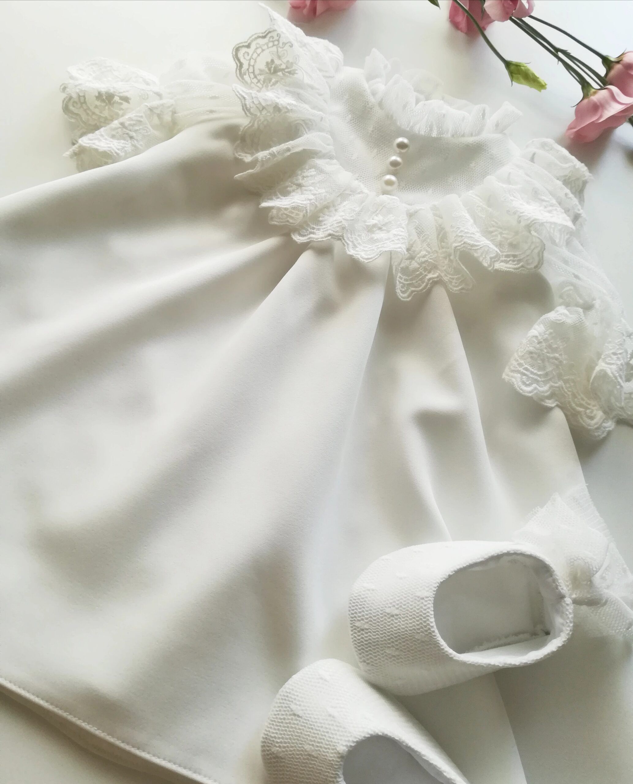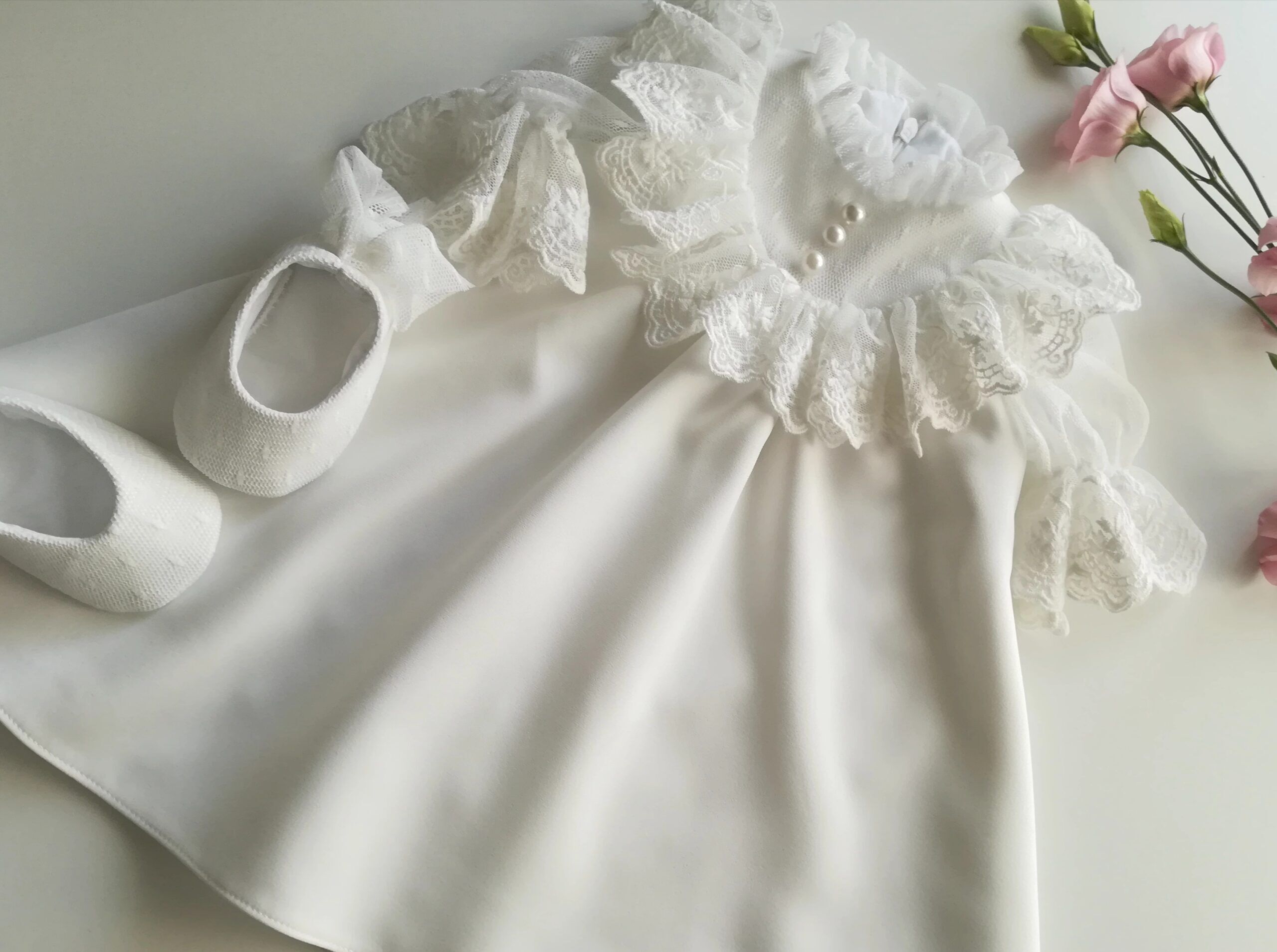 Rochita Georgia realizata din barbi,volane dantela,bumbac la interior,accesorizata cu nasturi perluta.Se pot achizitiona botosei 65 lei,bentita 35 lei,bonetica ,69 lei.
