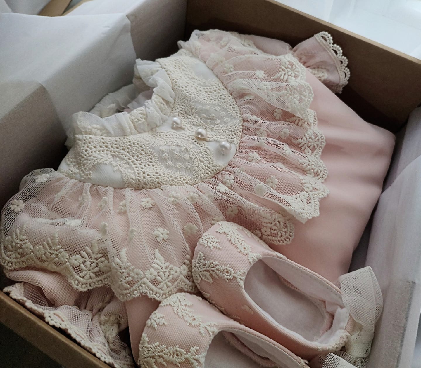 Rochita Mia creata pentu evenimente speciale… dantela brodata,nasturii perla,volanele sunt detaliile care transforma rochia Mia intr-una demna de o printesa.La interior captusala bumbac,se pot achizitiona accesorii din aceasi colectie ,bentita 35,bonetica 59lei,papucei 55 lei ( talpita 9-11,5 cm).
