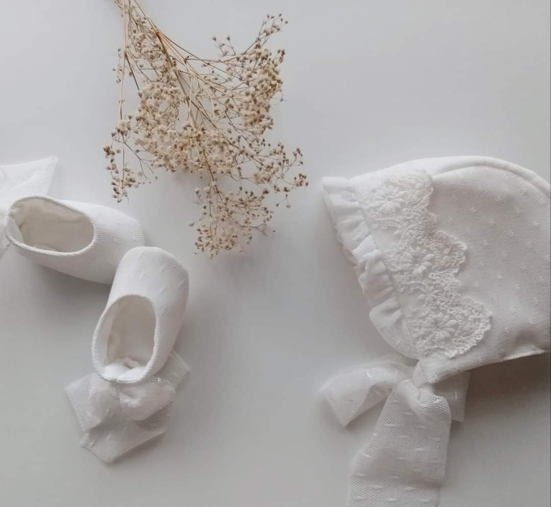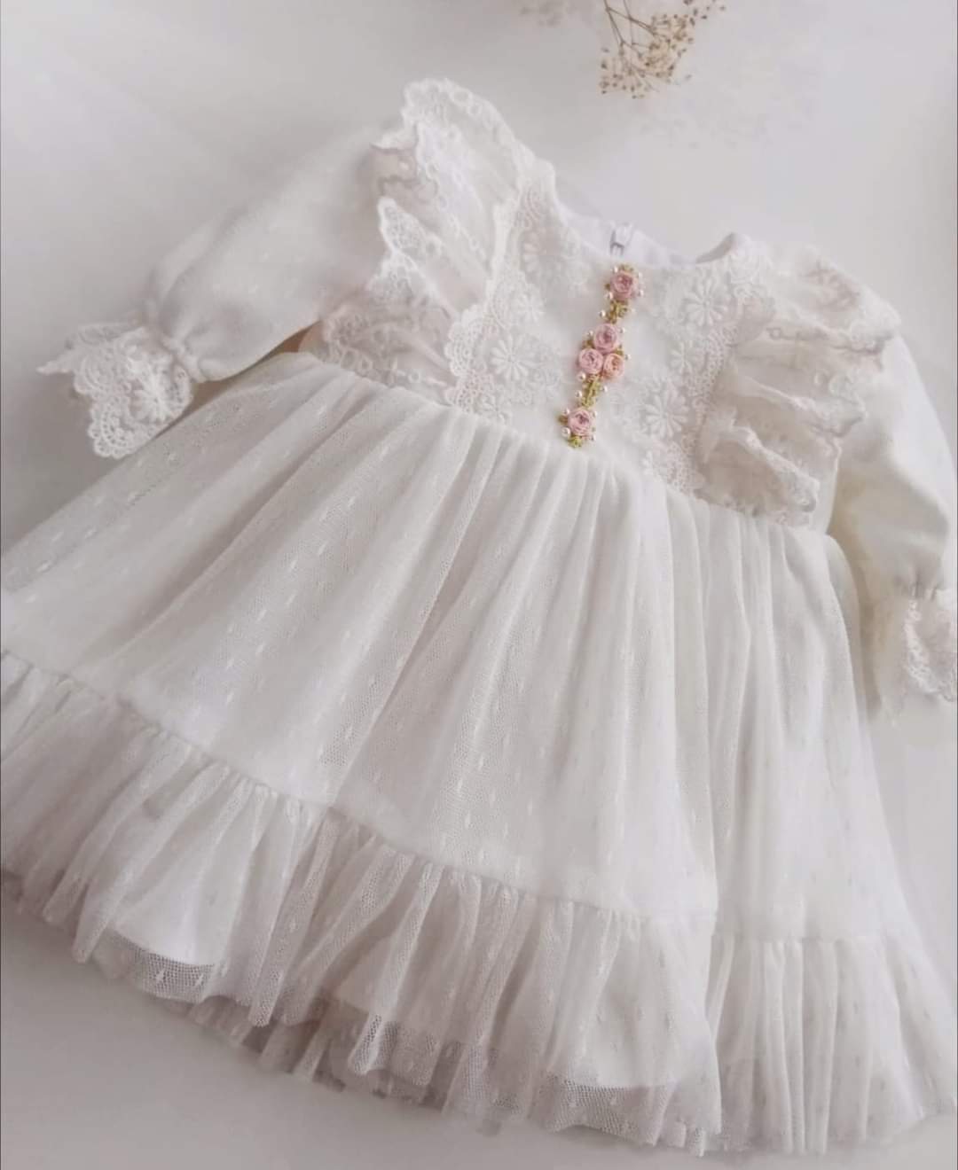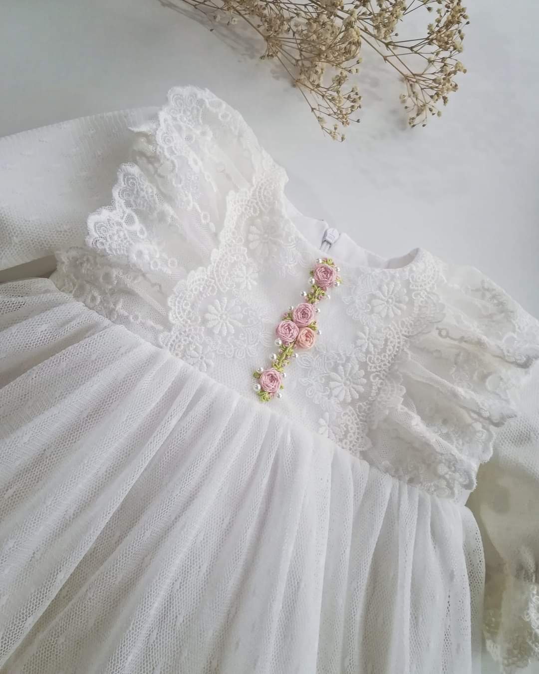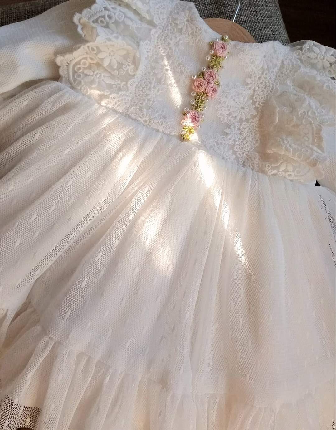 Rochita Scarlett unica , realizata din dantela delicata  ivory,broderie manuala,perlute…la interior 100% bumbac…se pot realiza boneta 59 lei,papucei 55lei.