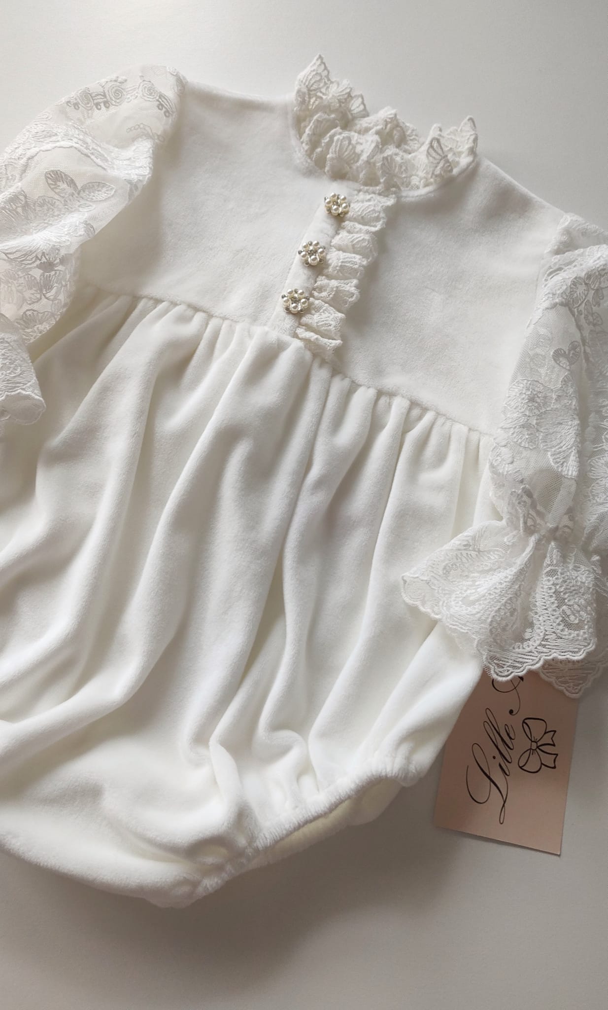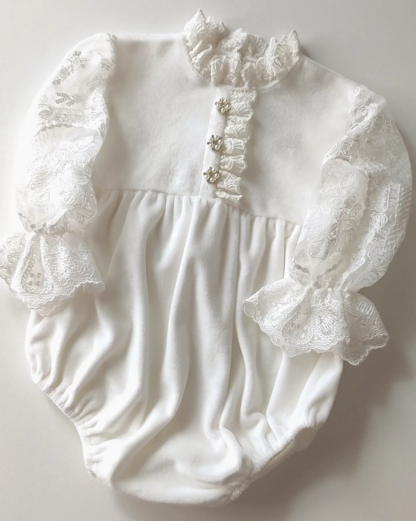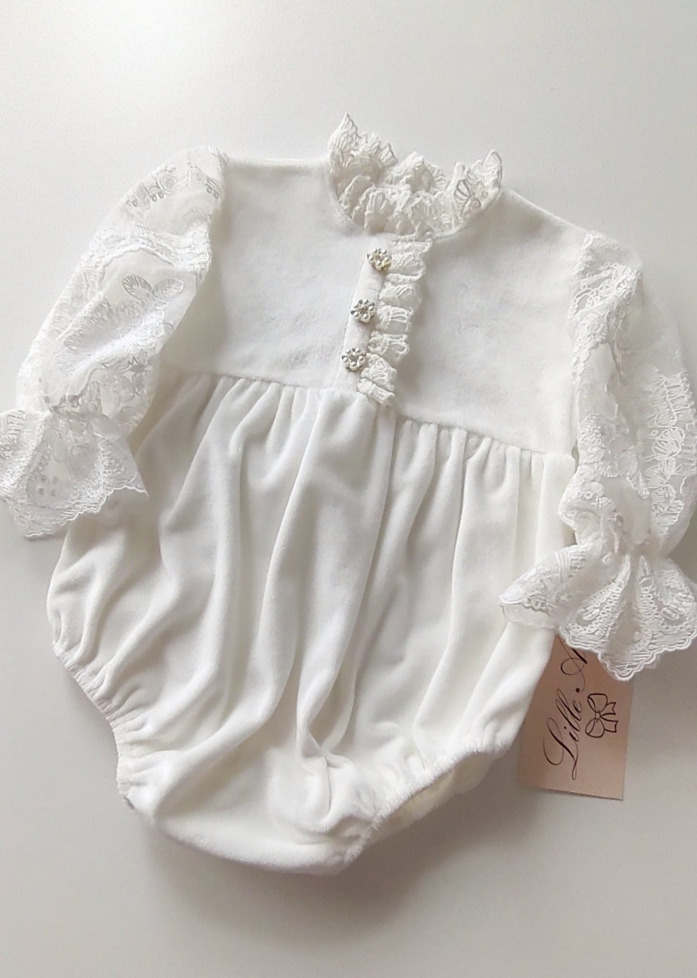 Model delicat , realizat din dantela brodata si catifea moale , accesorizat cu volane si nasturei bijuterie.