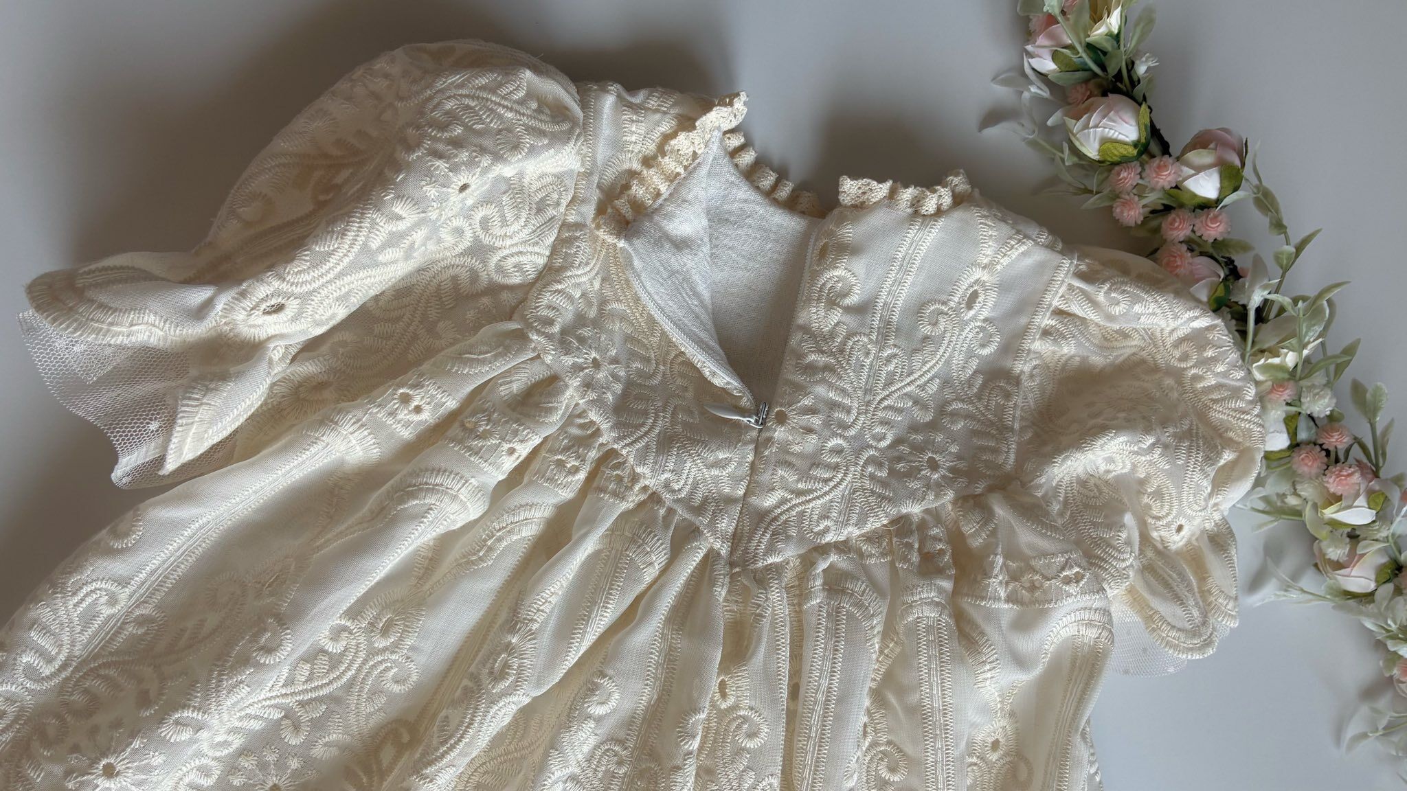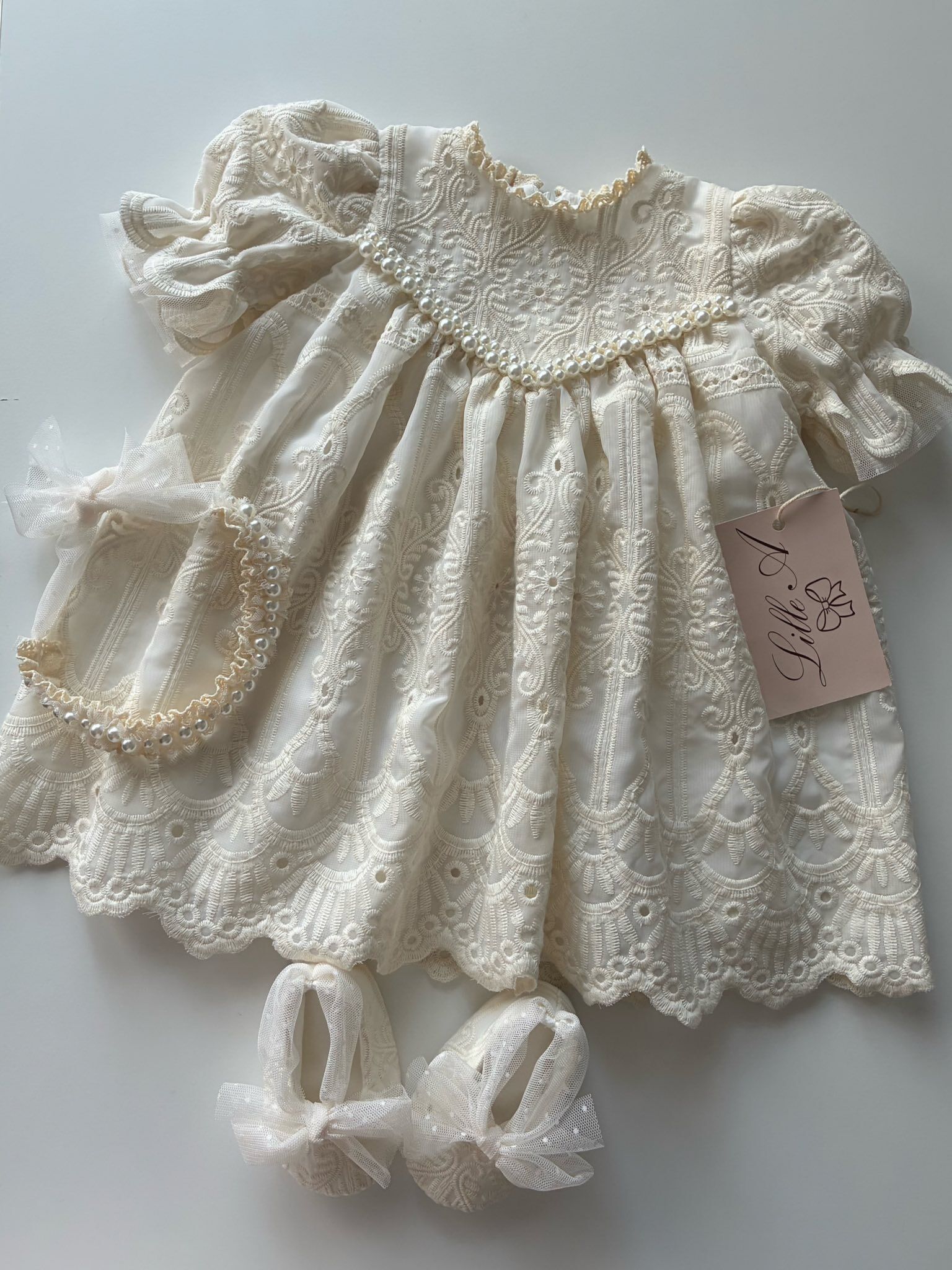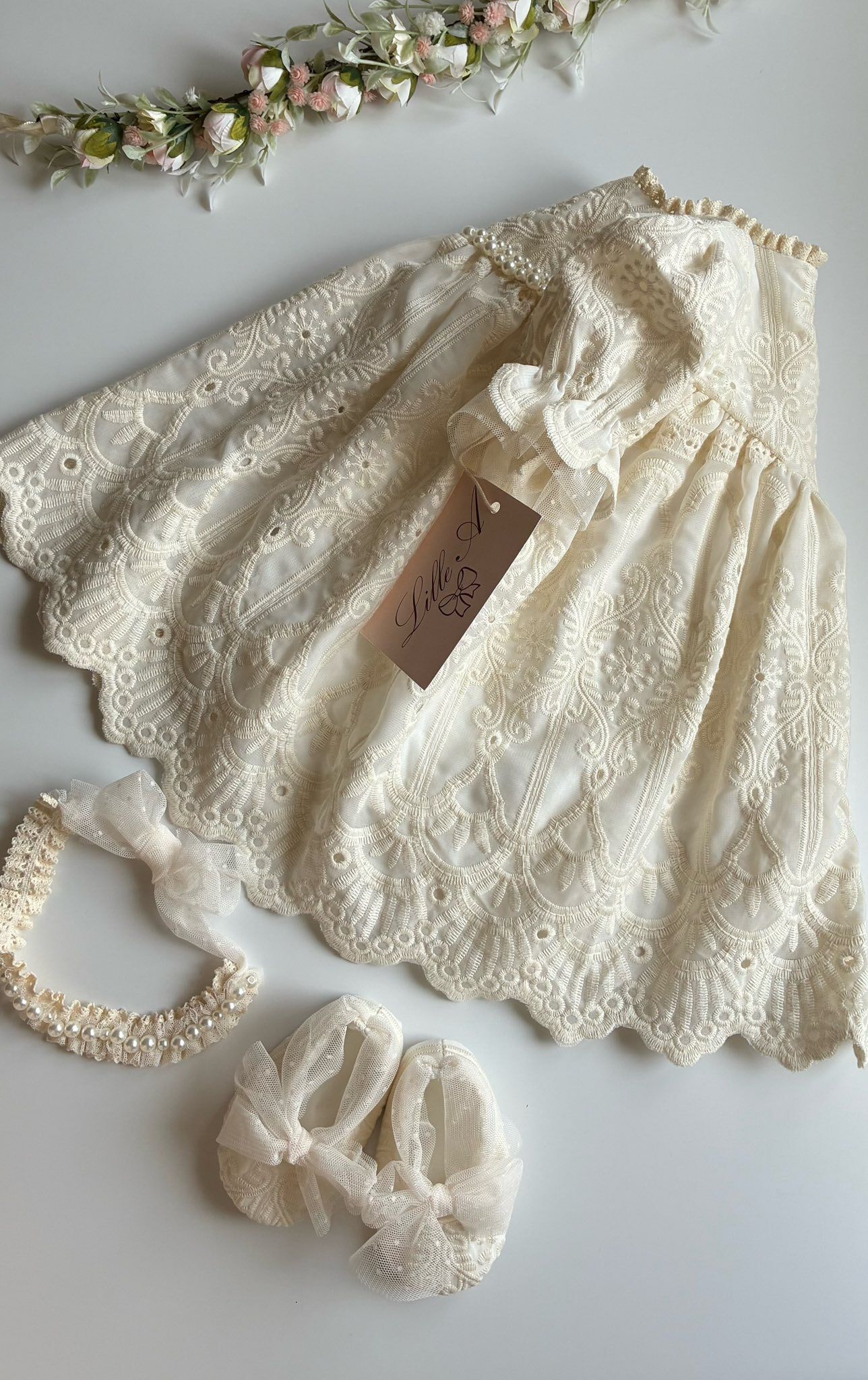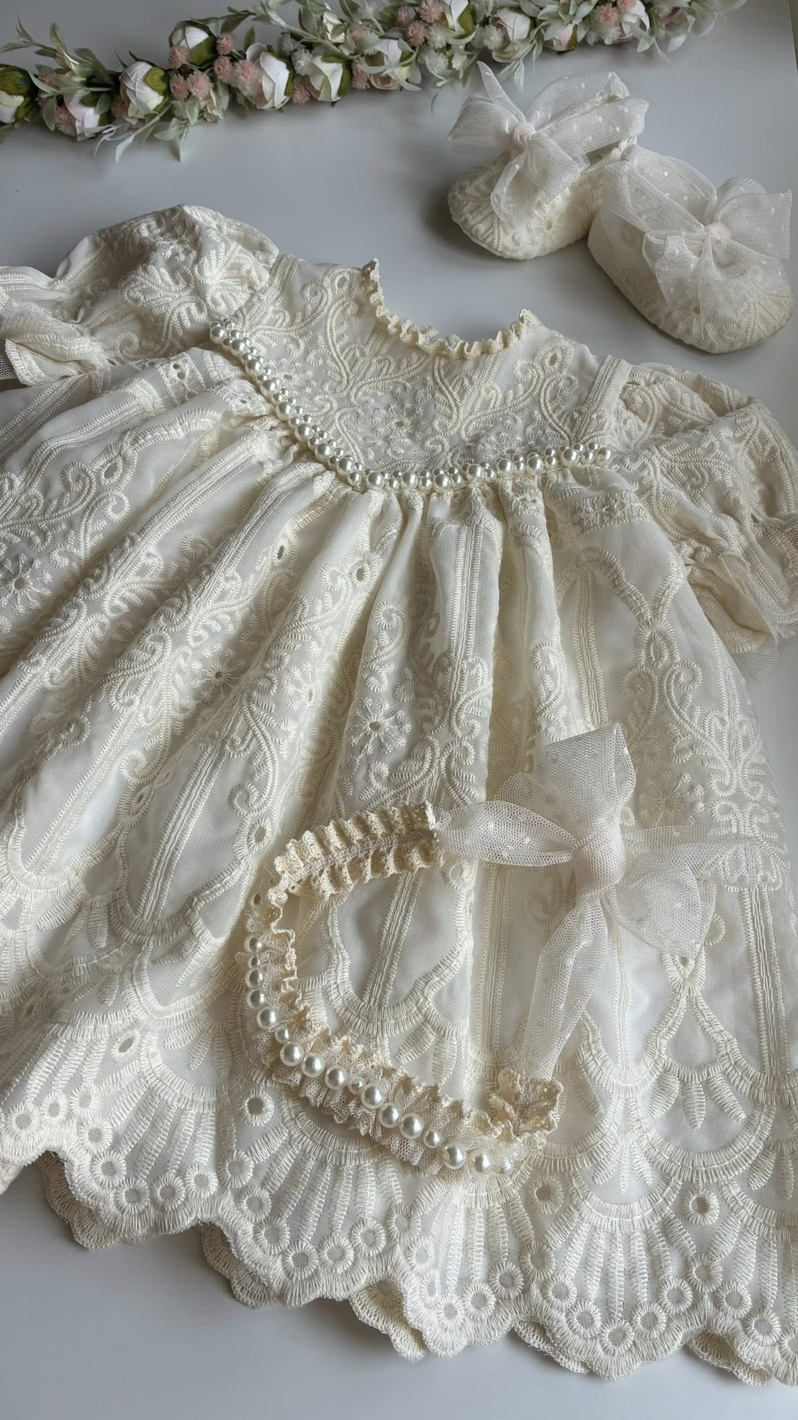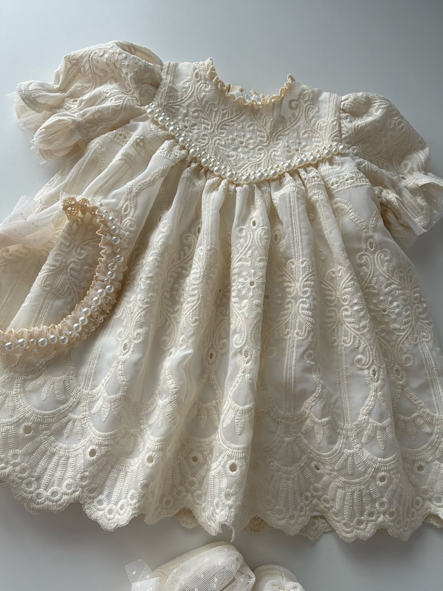 Rochita Eva realizata din dantela fina,cu broderii sofisticate.Designul clasic este completat de detalii atent lucrate:maneci scurte bufante si aplicatiicu perle fine cusute manual,oferind un plus de eleganta.