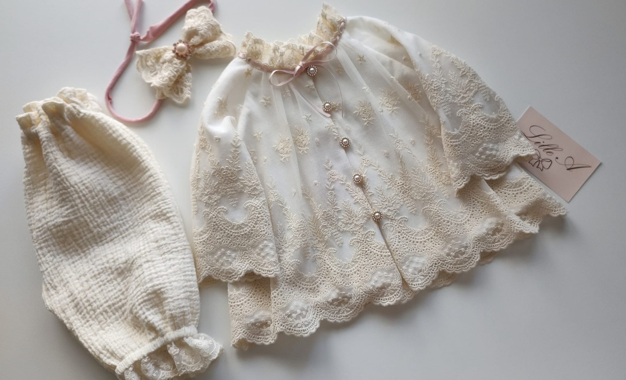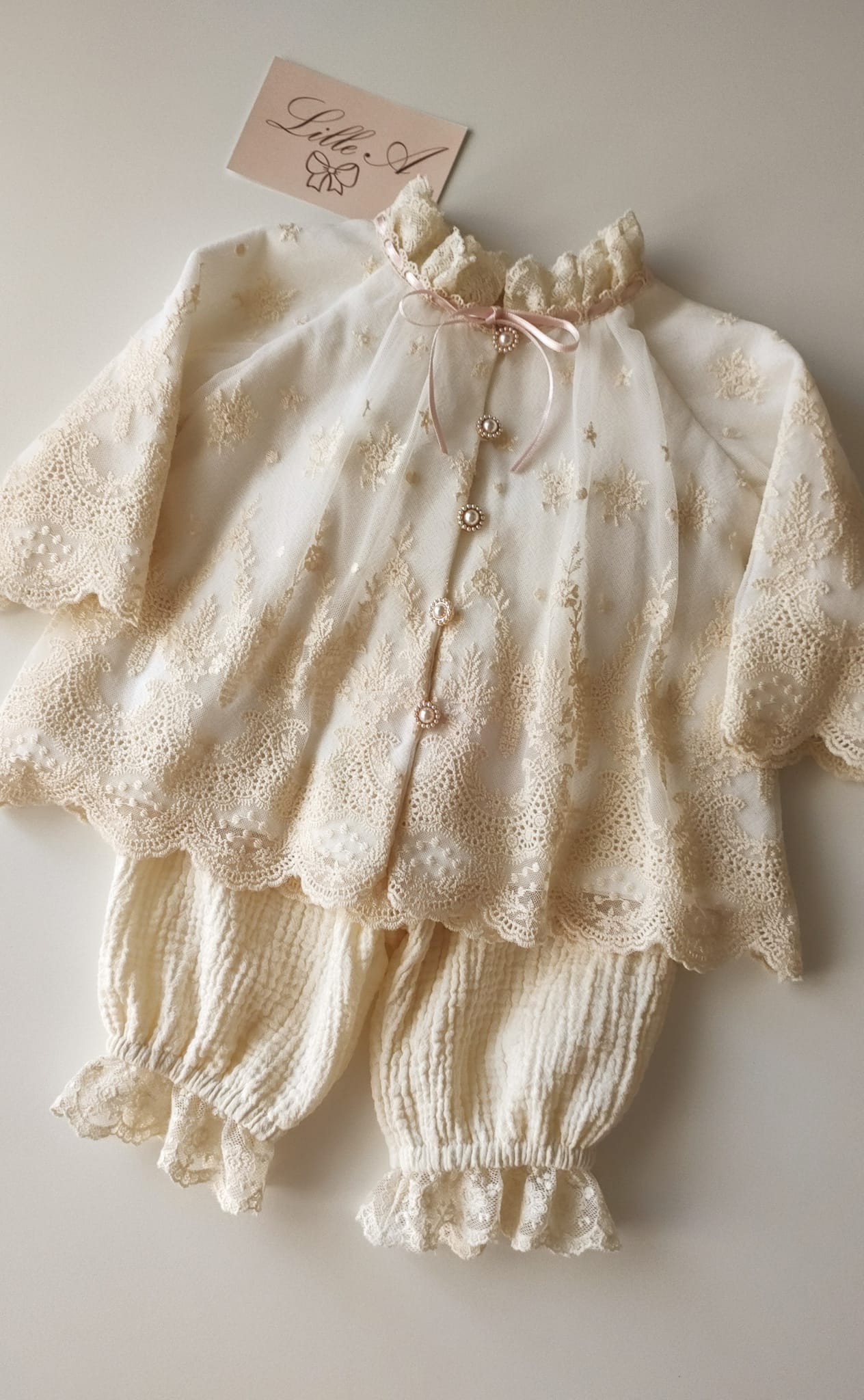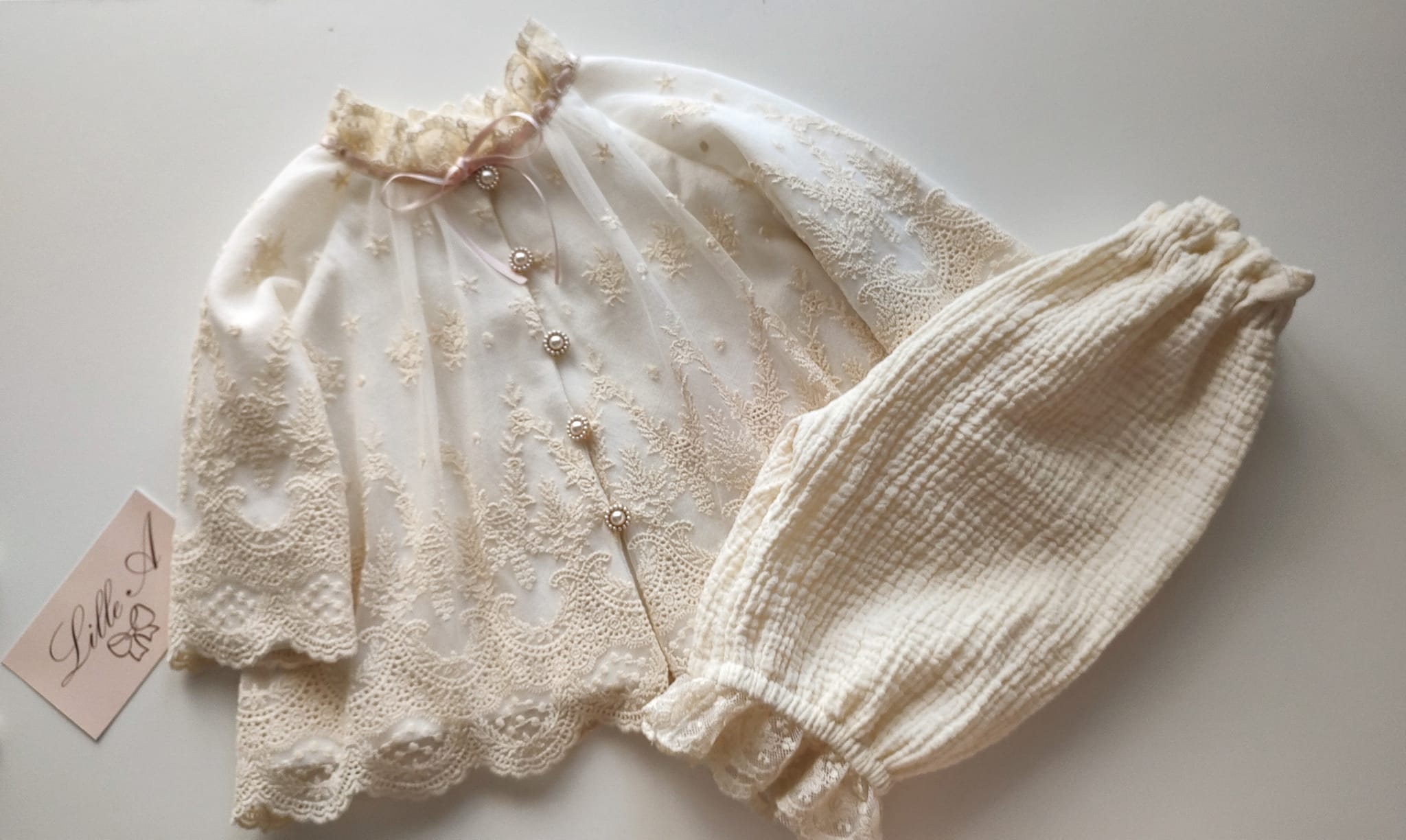 Set Lillian vintage realizat din dantela brodata,muselina organica,panza de in ,accesorizat cu nasturi bijuterie.