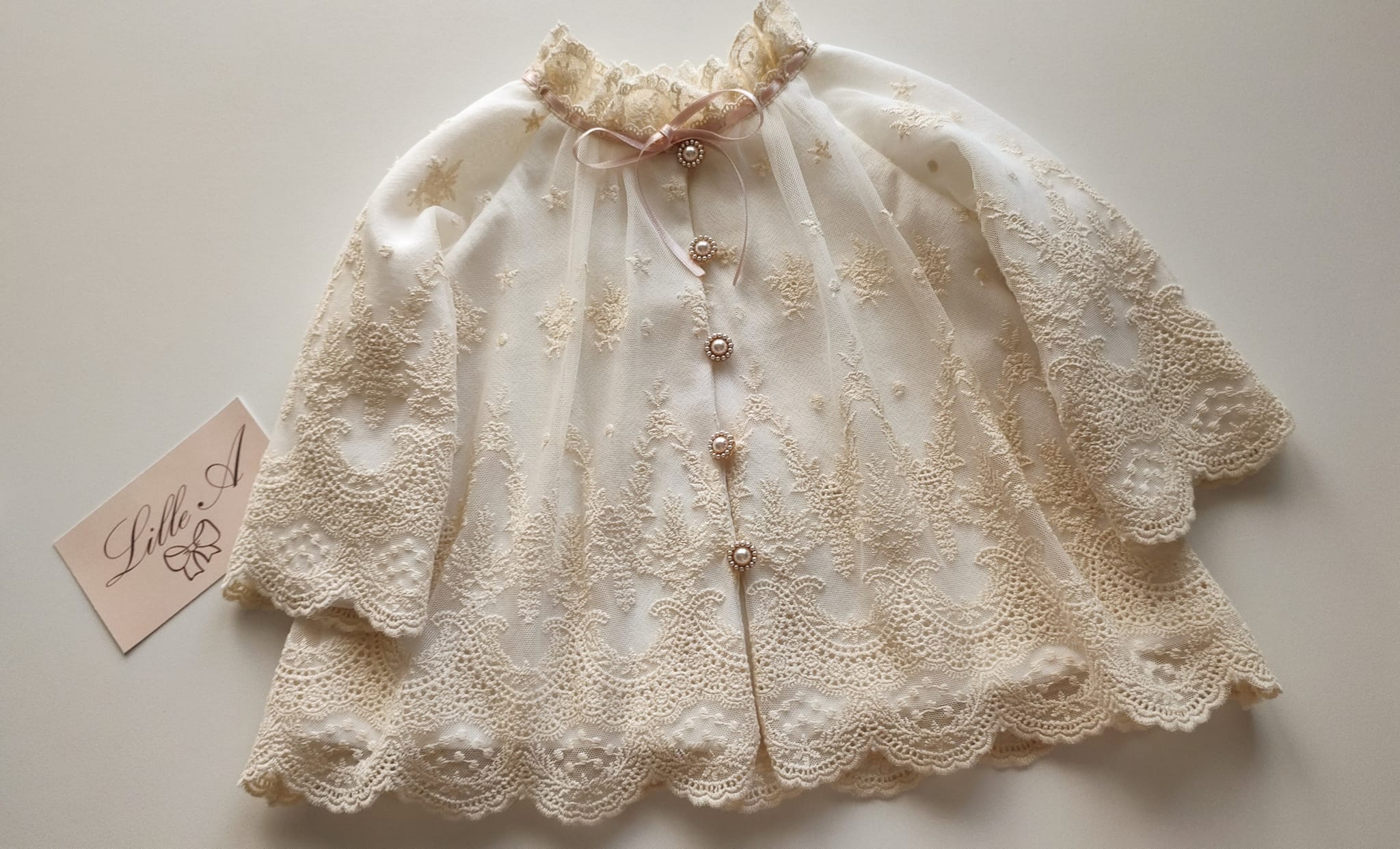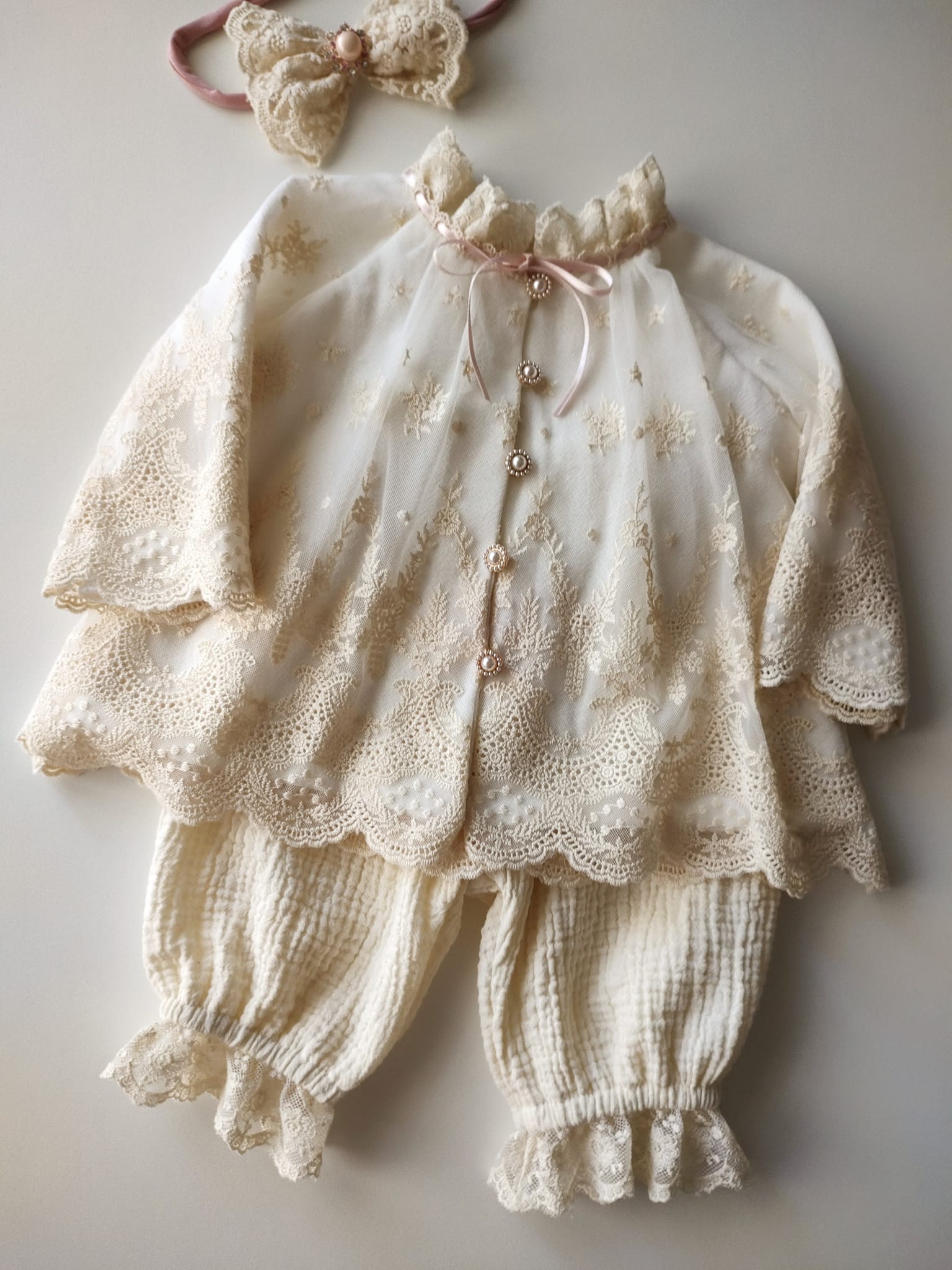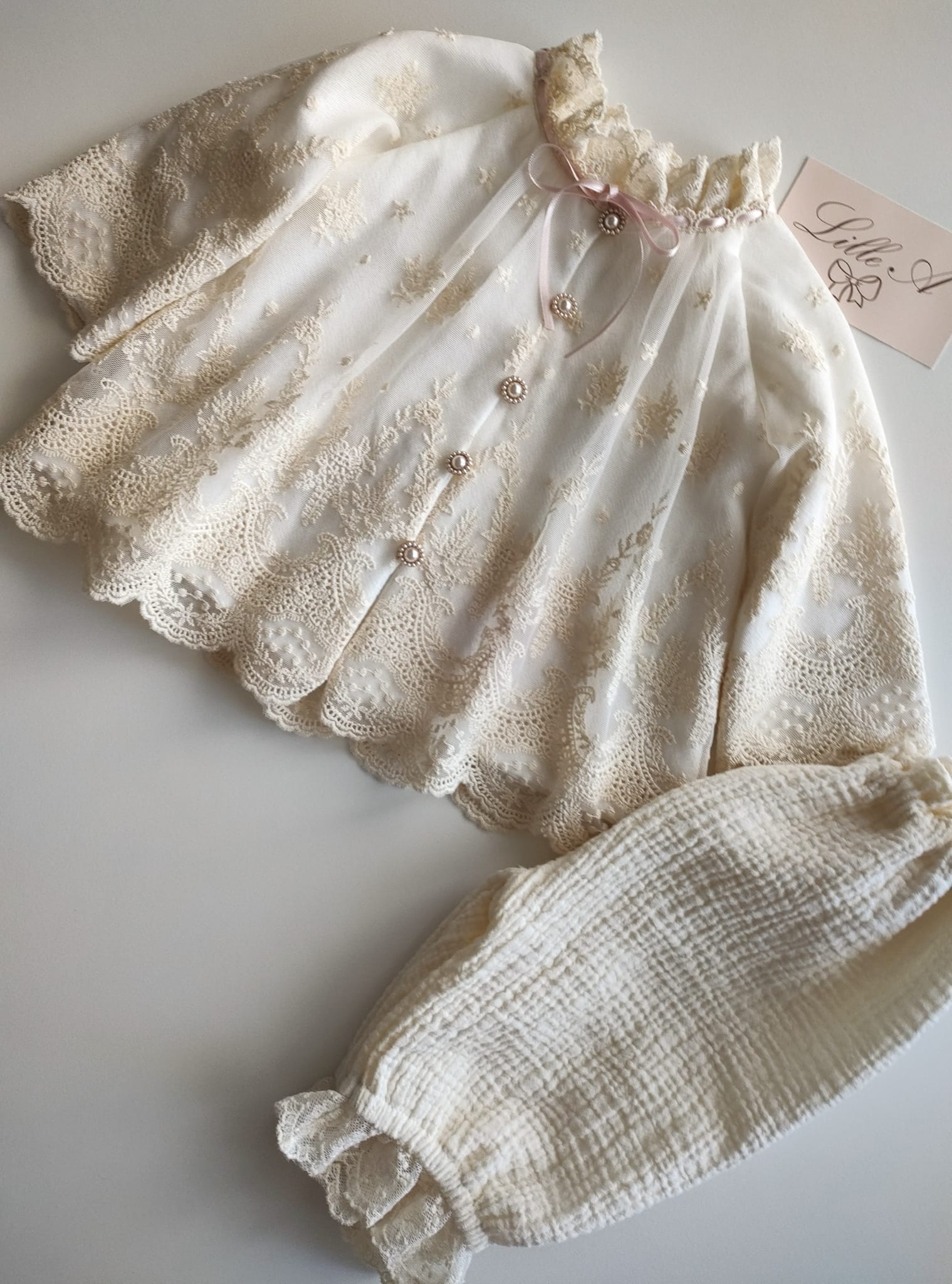 Set Lillian vintage realizat din dantela brodata,muselina organica,panza de in ,accesorizat cu nasturi bijuterie.